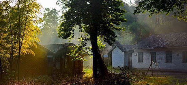 大坪村群山怀抱,民居古朴,生态环境良好,有枫香、水杉、香樟等观赏树木,特别是村口的两棵间距2.5米的枫香更为农家乐增添了一些古朴风味。